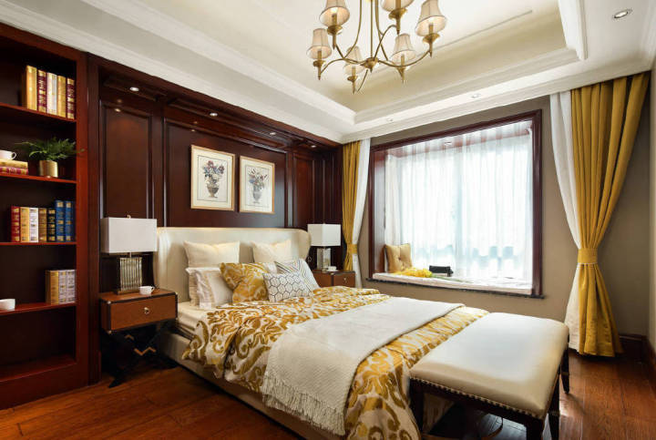 淺色系的背景色保證整個空間不會過于壓抑,主體色就可以采用復古色了。美式家具多為褐色和棕色,搭配相近色的地板,復古氣息滿滿,兼具濃郁的歷史文化感。