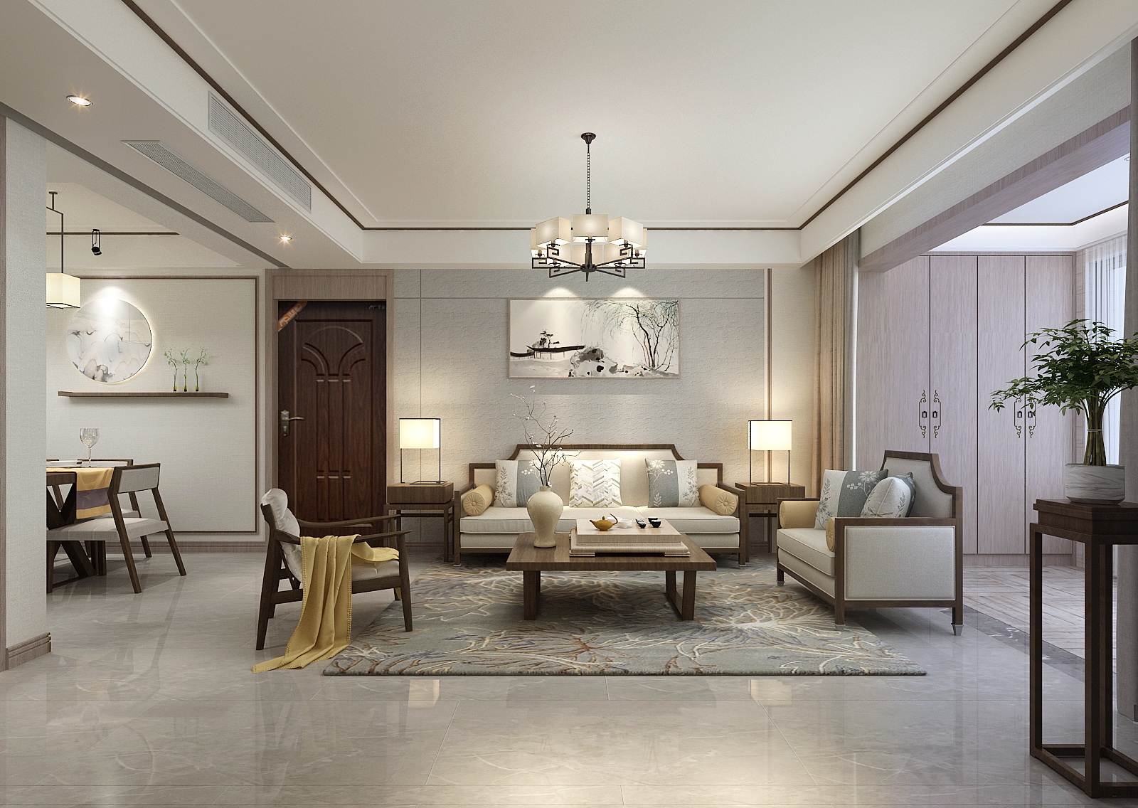 新中式風格講究空間視野的深淺有序,背景基調為淺色系,那么主體顏色多搭配顏色較深的紅木家具。
